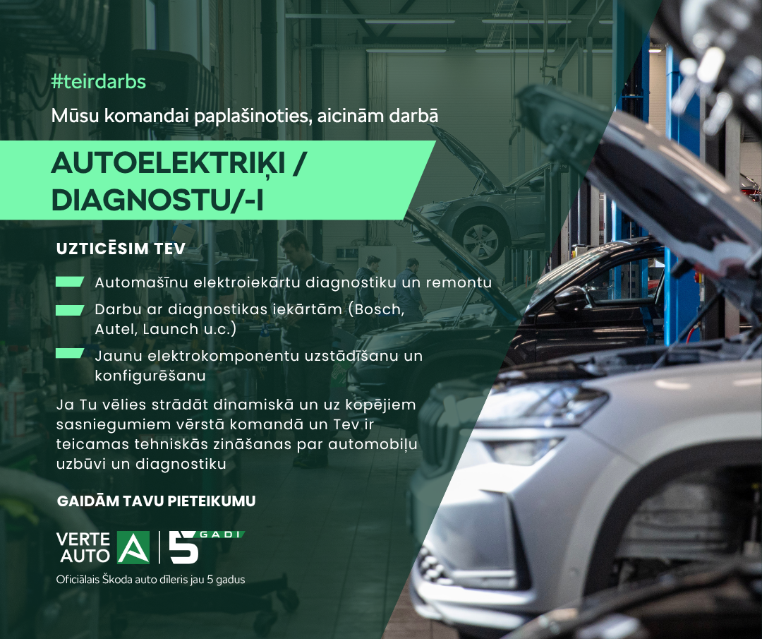 Mūsu komandai paplašinoties, aicinām darbā autoelektriķi / diagnostu/-i, tāpēc, ja Tu vēlies strādāt dinamiskā un uz kopējiem sasniegumiem vērstā komandā, gaidām Tavu pieteikumu!
