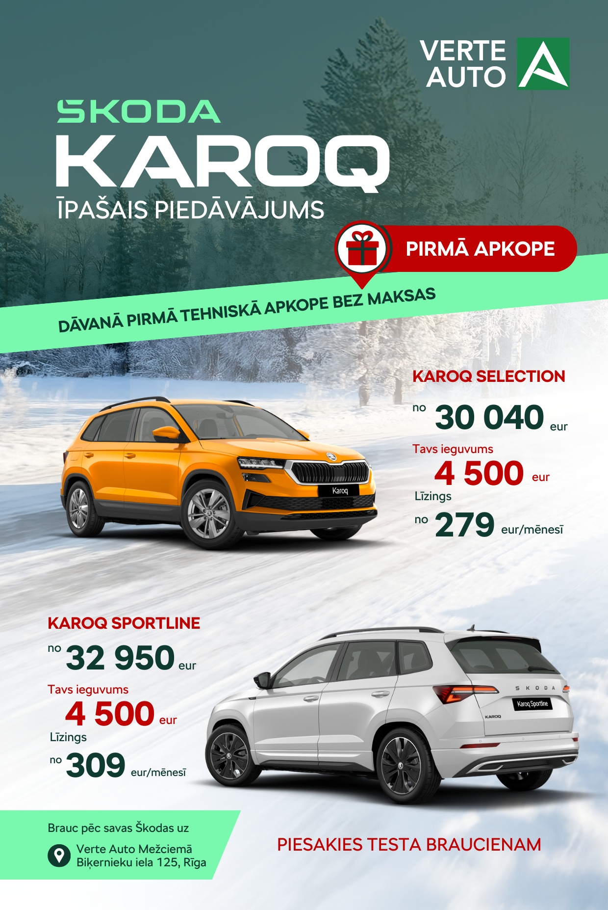 Ja meklē drošu, stabilu un daudzpusīgu krosoveru, kas jūtas pārliecinoši arī ziemas apstākļos, Škoda Karoq ir tieši tas, kas vajadzīgs. Tagad pie Verte Auto tas pieejams ar īpašu piedāvājumu un patīkamu bonusu.