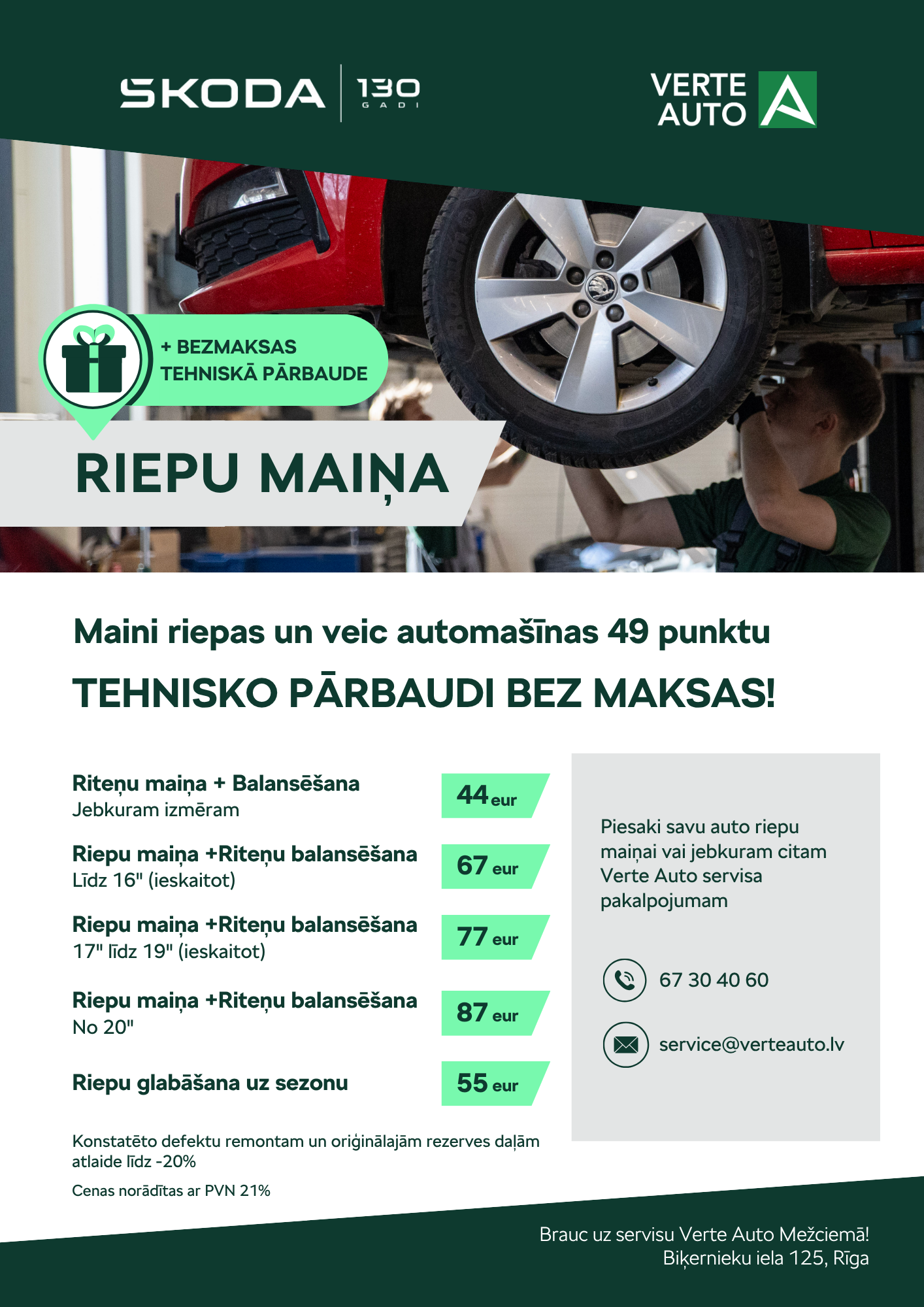 Tomēr ir divas reizes gadā, kad auto servisu apmeklē lielākā daļa autovadītāju – mainot riepas pirms vasaras un pirms ziemas sezonas. Tādēļ, rūpējoties par klientu ērtībām, drošību un arī “maciņu”, Škoda auto dīleris Verte Auto visiem autovadītājiem, kas Verte Auto veic riepu maiņu, piedāvā veikt arī 49 punktu tehnisko pārbaudi jeb automašīnas “veselības pārbaudi” BEZ MAKSAS!