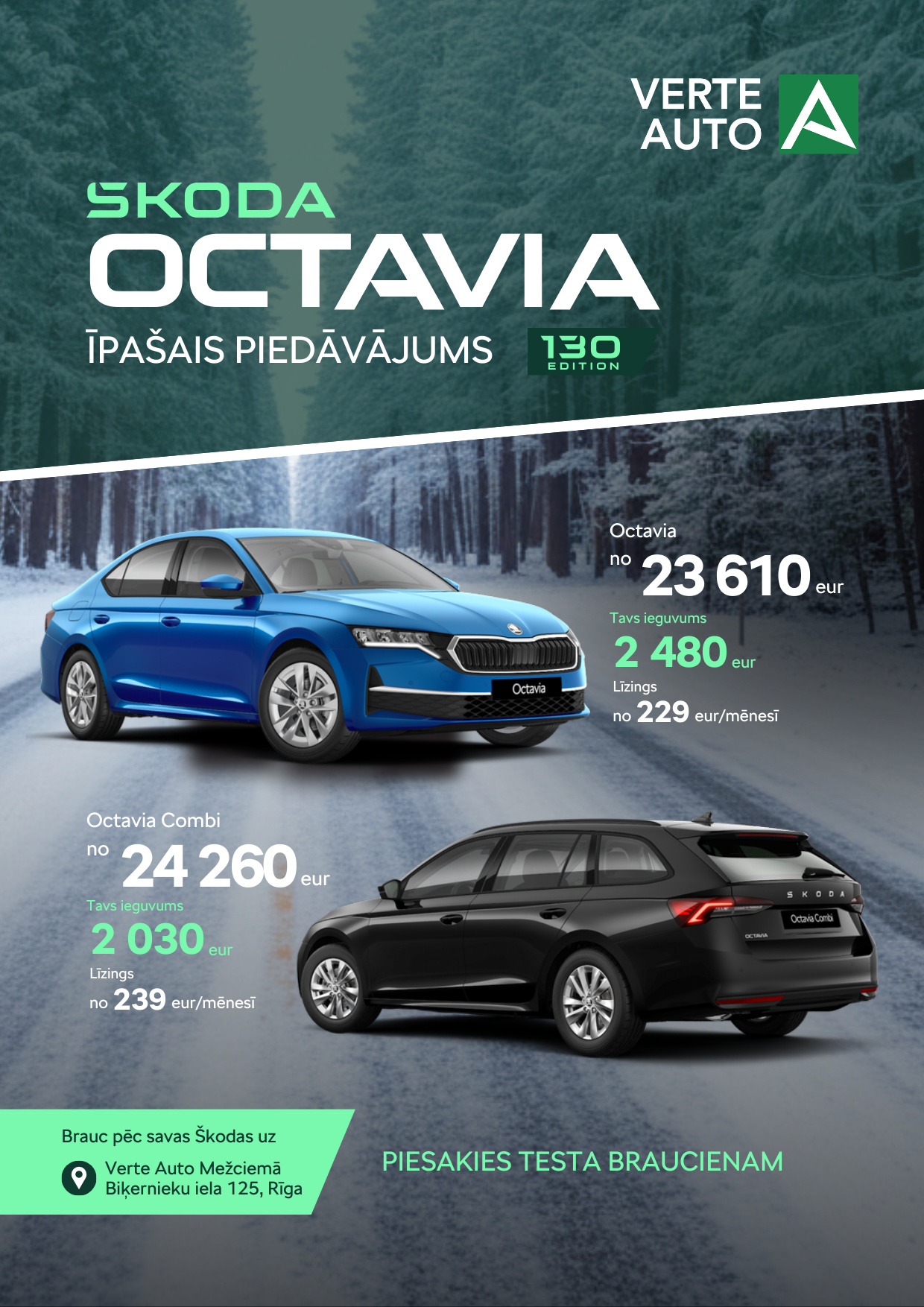Vai Tu zini, ka pašlaik pie Verte Auto vari iegādāties Škoda Octavia par cenu, sākot no tikai 23 610 eiro? Šis ir lielisks brīdis, lai izvēlētos vienu no populārākajām un uzticamākajām automašīnām Latvijā!