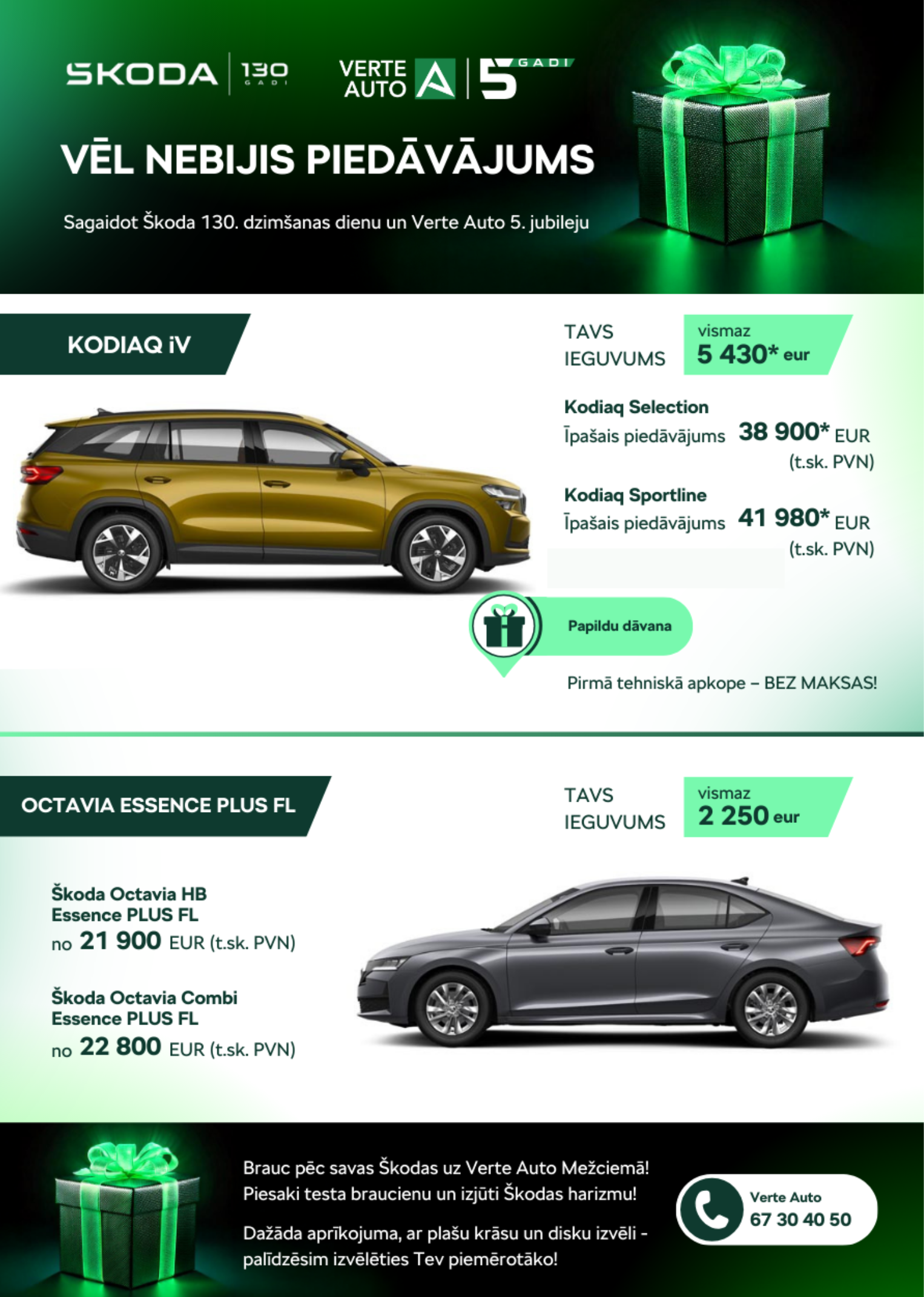 Tādējādi, sagaidot Škoda 130. dzimšanas dienu un Verte Auto 5. jubileju, akcijas ietvaros iegādājoties Škoda Kodiaq Selection vai Škoda Kodiaq Sportline un izvēloties sev pieejamos atbalsta instrumentus, klienta ieguvums var sasniegt teju 10 000 eiro.