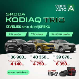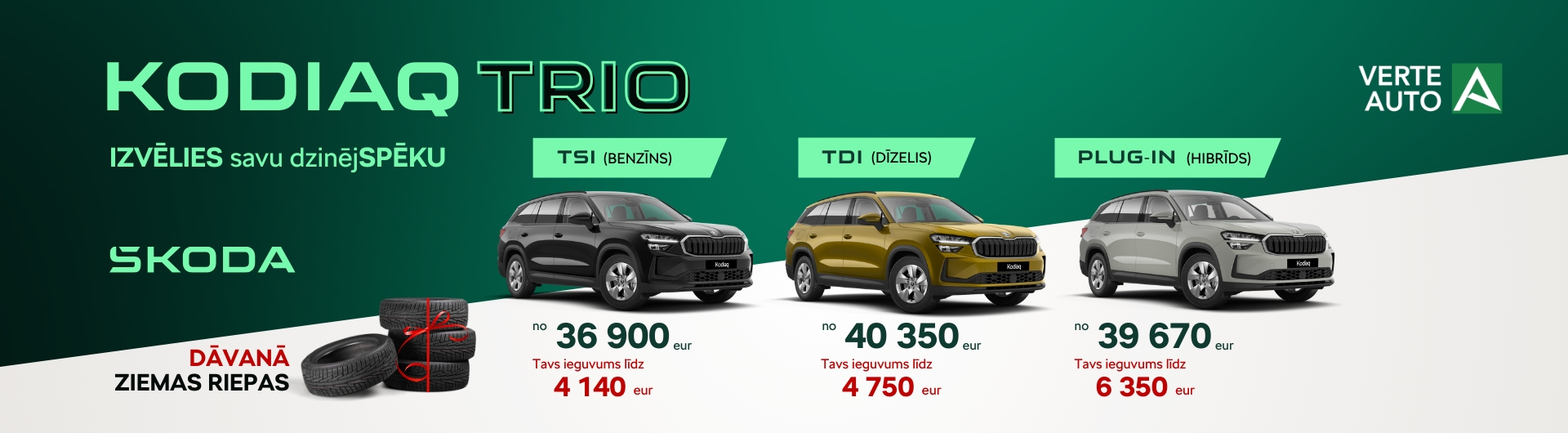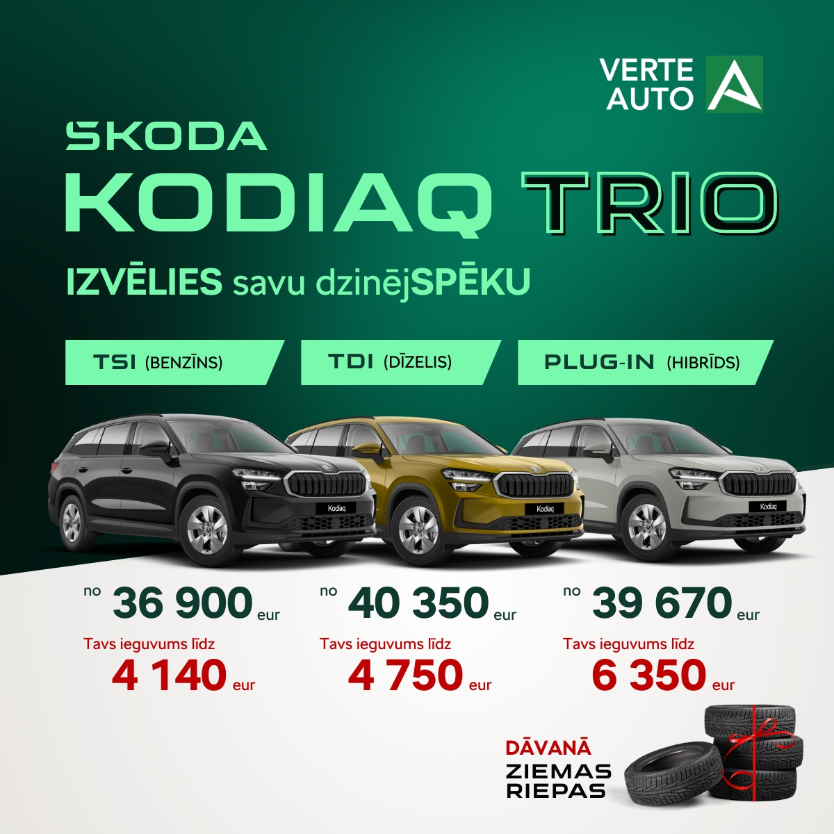 ✨ Trīs lietas – labas lietas! 🍀Labs SUV, pareizais dzinējs un izdevīga cena. Un tas viss vienā vārdā - Kodiaq TRIO pie Verte Auto Rīgā, Mežciemā! Škoda Kodiaq TRIO nozīmē, ka Tu vari izvēlēties kādu no trim jaudas avotiem - katram savs raksturs, katram savas priekšrocības. 🔹 TSI (benzīns) – no 36 900 eiro Tavs ieguvums līdz 4 140 eiro 🔹 TDI (dīzelis) – no 40 350 eiro Tavs ieguvums līdz 4 750 eiro 🔹 Plug-in Hybrid – no 39 670 eiro Tavs ieguvums līdz 6 350 eiro Un vēl - ziemas riepas dāvanā! ❄️ Neatkarīgi no tā, vai Tev svarīga ir dinamika, ekonomija vai elektriska braukšana ikdienā – Kodiaq TRIO pie Verte Auto piedāvā Tev vēlamāko risinājumu! 👉 Izvēlies savu dzinēja spēku un piesakies testa braucienam jau šodien! 📍 Verte Auto, Biķernieku iela 125, Rīga 📞 +371 67 30 40 50 | 🌐 https://www.verteauto.lv/lv/kodiaq-trio
